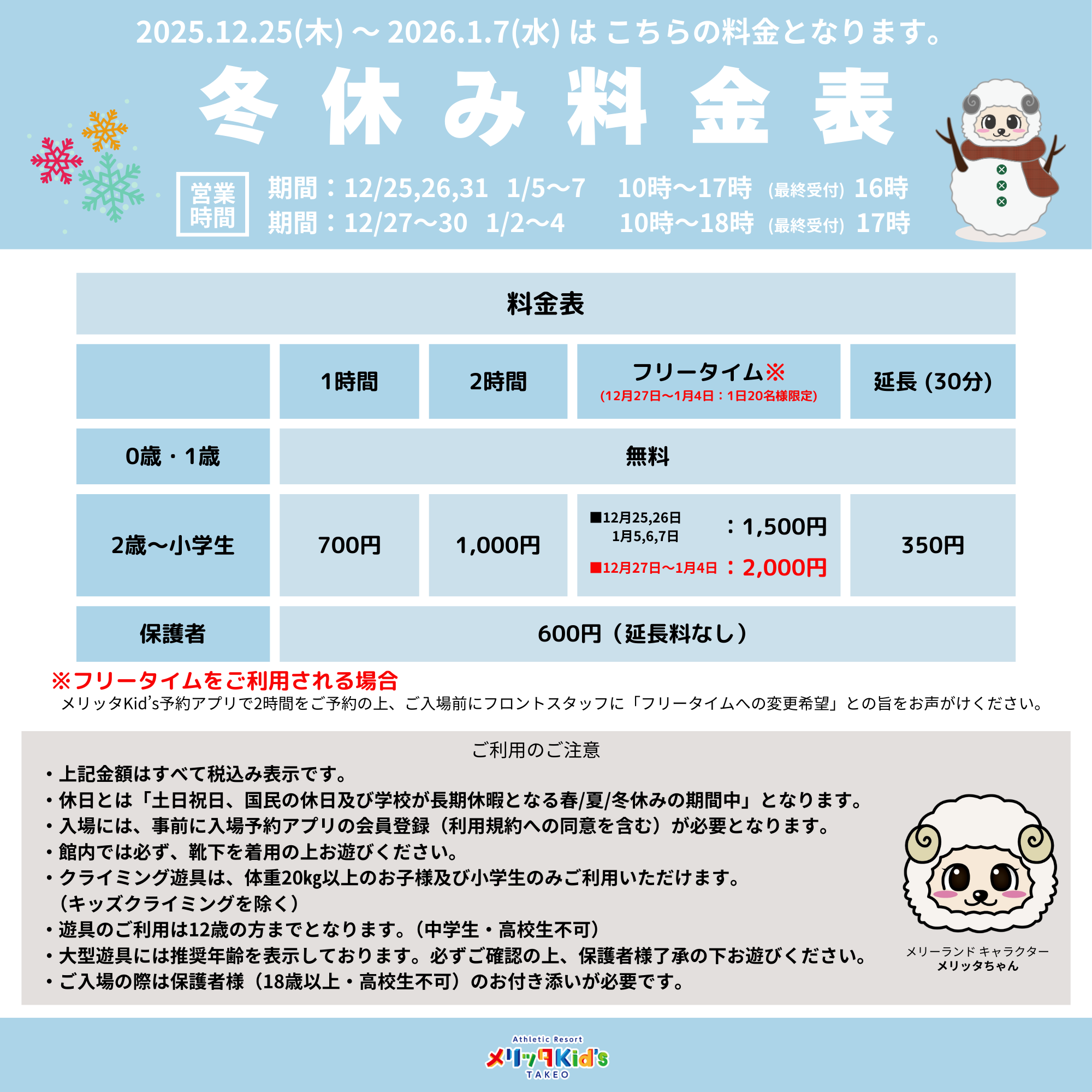 冬休み料金のお知らせ
