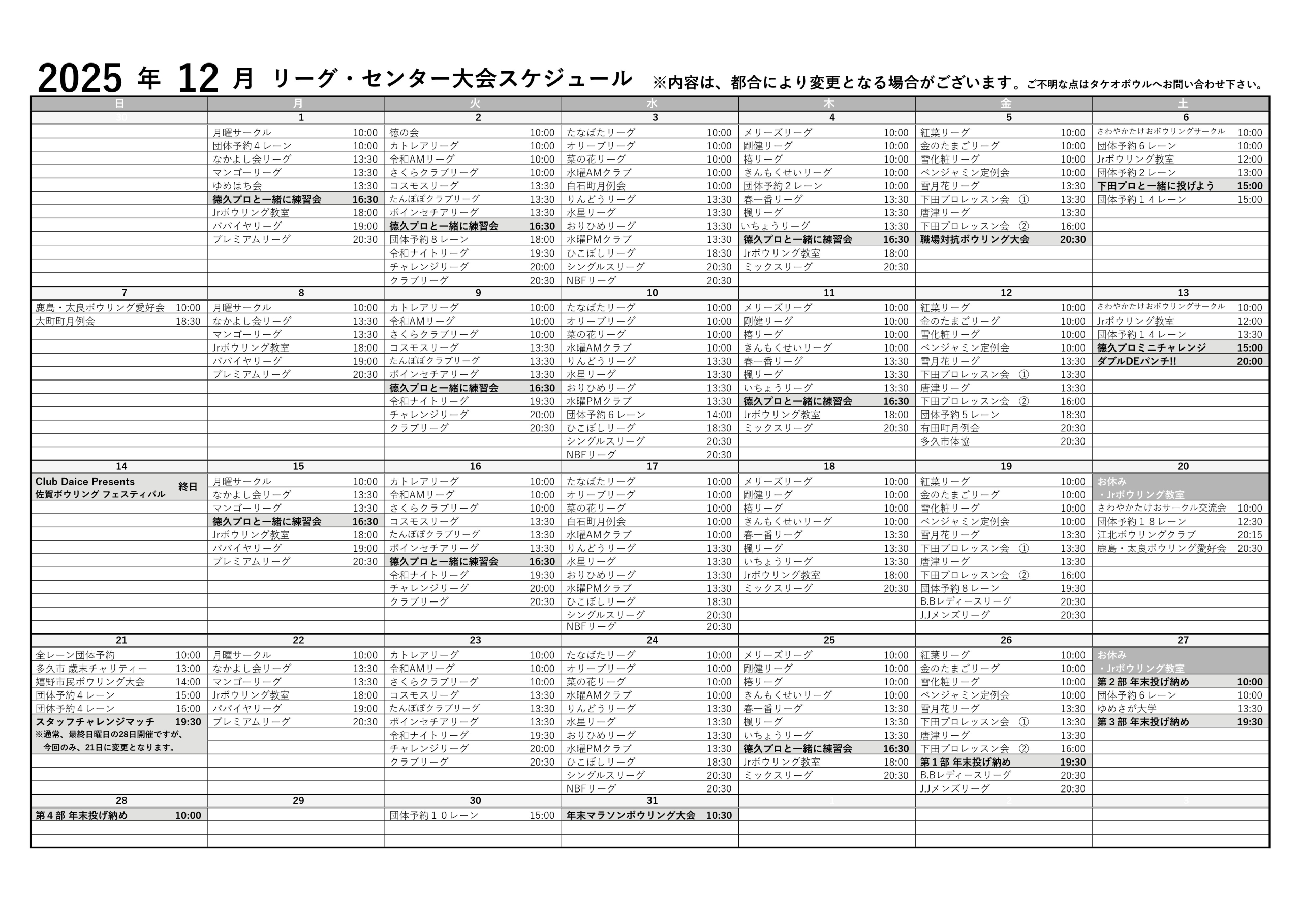12月 リーグ・大会・徳久プロ スケジュール