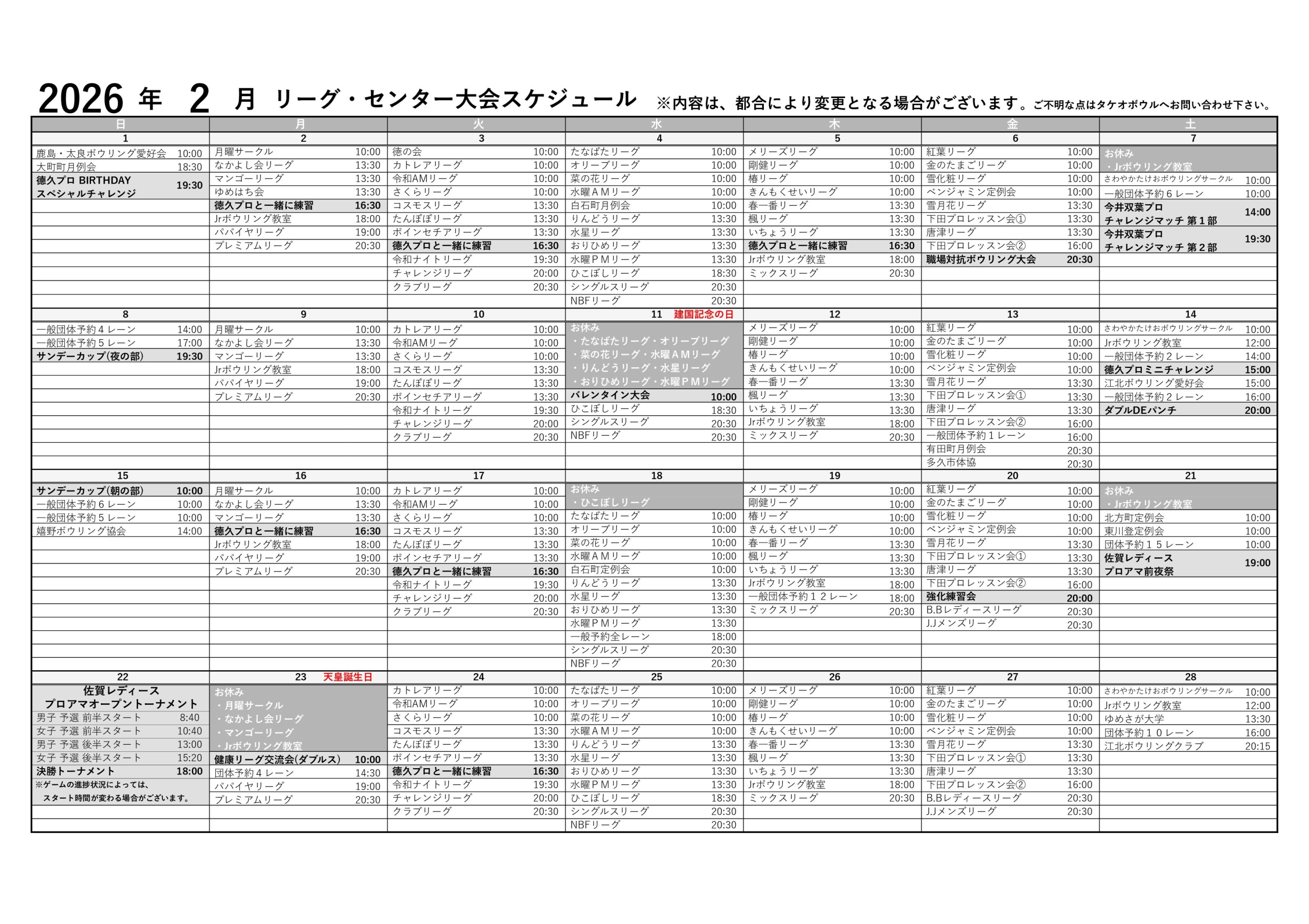 2026年 2月 リーグ・大会・徳久プロ スケジュール